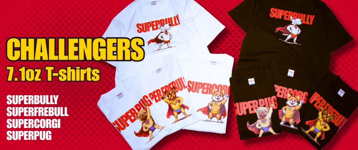 ヒーローになったブルテリアが、今日も挑戦する! グラフィックTシャツシリーズ「CHALLENGERS」登場! ブルテリアの持つ“怖れ知らず”なスピリットを、 ヒーローとして描いた「CHALLENGERS」シリーズの一枚です。 フロントには堂々と立つヒーローブルテリア、 背中にはシリーズロゴをプリント。 前からも後ろからも、挑戦者の存在感を主張します。 ボディは透けにくい7.1ozのワイドTシャツ。 タフな生地感と余裕のあるシルエットで、 一枚で着てもスタイルが決まります。 強さも、覚悟も、ユーモアも。 犬好きのための“挑戦者”Tシャツです。 Tシャツ本体のお色はホワイトとブラック 7.1オンスの粗めな生地感や大きめのアームホール、ルーズなシルエットがカッコイイ仕上がりのTシャツです。ドライタッチな質感のオープンエンド糸が高密度に編みこまれ、力強くシャリ感のある生地です。洗いこむほどに生地表面の粗野感が強まり、縮みや型崩れの少ないタフ&アメリカンライクな生地へと育ちます。ネックラインも高めで首まわりにしっかりとフィットします。 Tシャツサイズの見方 身丈(みたけ)・肩幅・身幅・袖丈の4つの項目で表されます。 ****************************** (1)身丈:衿のリブの付け位置~裾まで (2)身巾:左右の脇から1.0cm下がった巾 (3)肩巾:左右の肩の付け根~付け根まで (4)袖丈:肩の付け根~袖先まで 身丈×身巾×肩巾×袖丈(cm) ----------------------------- Sサイズ:67×50×48×21 Mサイズ:70×54×51×22 Lサイズ:73×57×54×23 XLサイズ:76×60×57×24 XXLサイズ:79×63×60×25 ****************************** 商品の素材 綿100% ※お洗濯の際は裏返していただくとプリントが長持ちします。 乾燥機のご使用は避けてください。プリントが剥がれる恐れがございます。 購入の際の注意点 ■発送、キャンセルについて ・ハンドメイドでおつくりしていますので、在庫がない場合は入金確認後7日間程度 (土日祝日除く)かかることがございます。 ・配達日、配達時間指定はできませんのでご了承ください。 ・お届けした商品がサイズが合わない場合は交換を承ります。 その場合の返送料はお客様のご負担でお願い申し上げます。 ご希望の際は、事前にメールもしくはインスタグラムのDMにて ご連絡お願いします。 ・発送先の住所に不備があった場合の再送、返送につきましては、 再度送料を頂きますのでご了承ください。 ・モニターやお使いのパソコン環境により、実際の色とは異なる 場合がございます。 ※この商品は、代金引換がご利用になれませんので予めご了承ください。