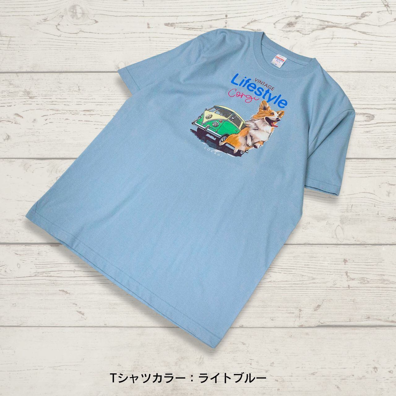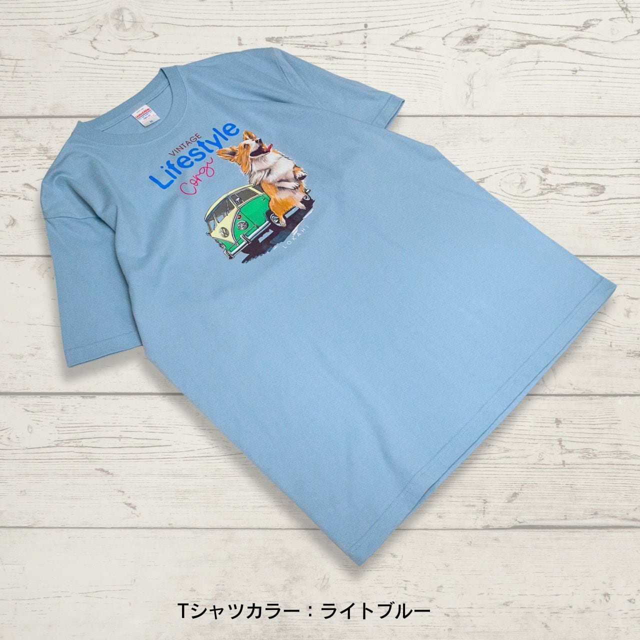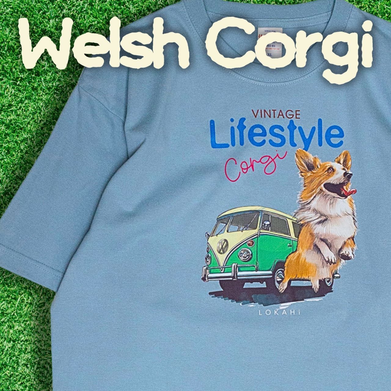 ヴィンテージカーの雰囲気と、コーギーの楽しそうな表情がマッチした遊び心あふれるデザイン。