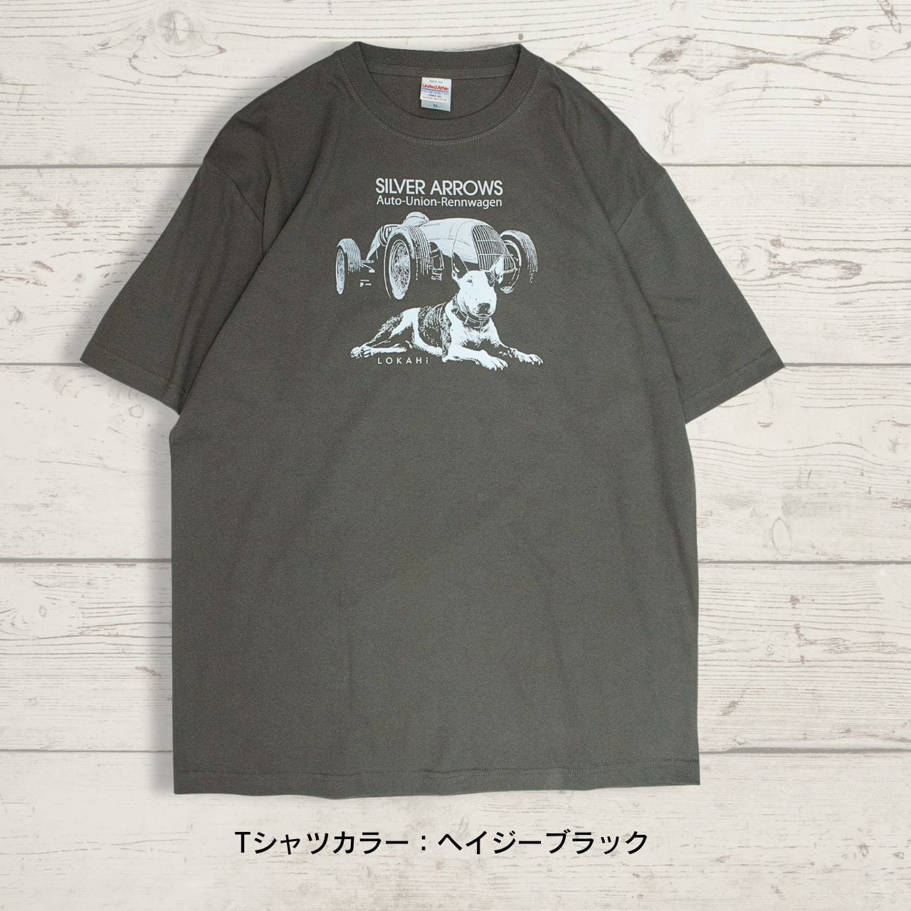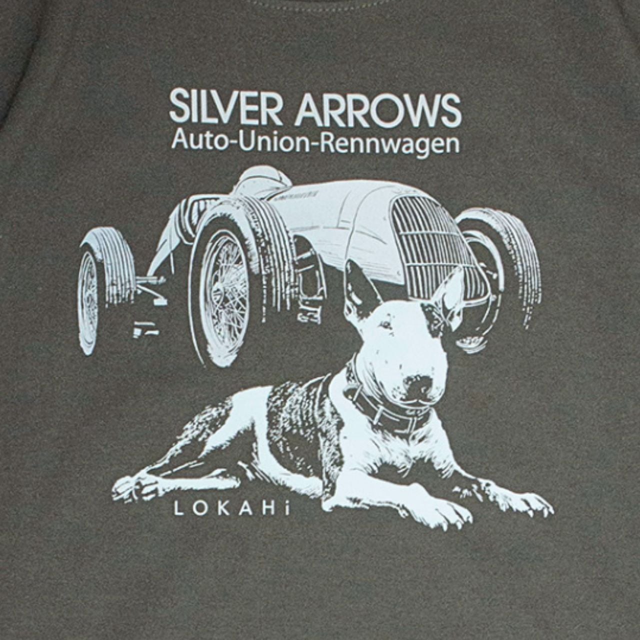 1930年代の名車「SILVER ARROWS(Auto Union Rennwagen)」とブルテリアを組み合わせた、ヴィンテージモチーフのTシャツ。