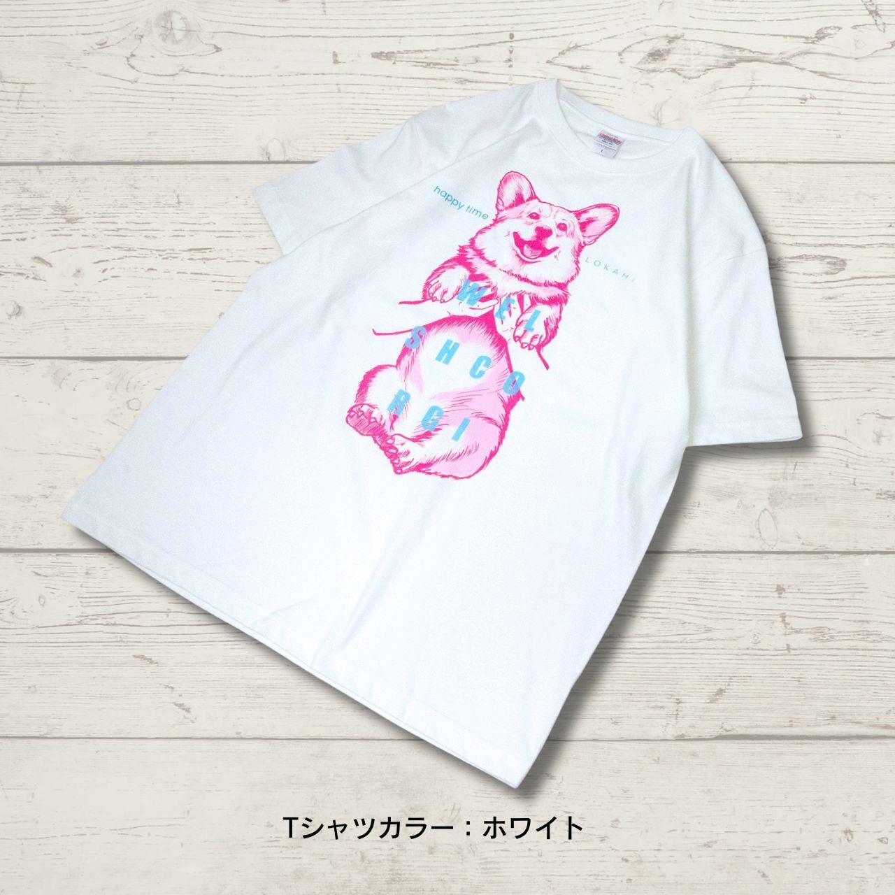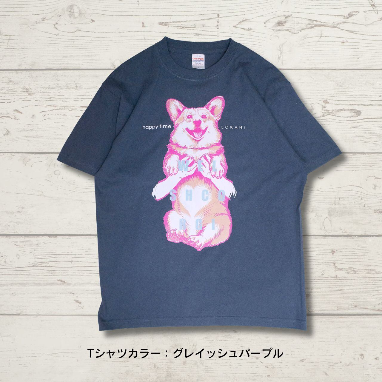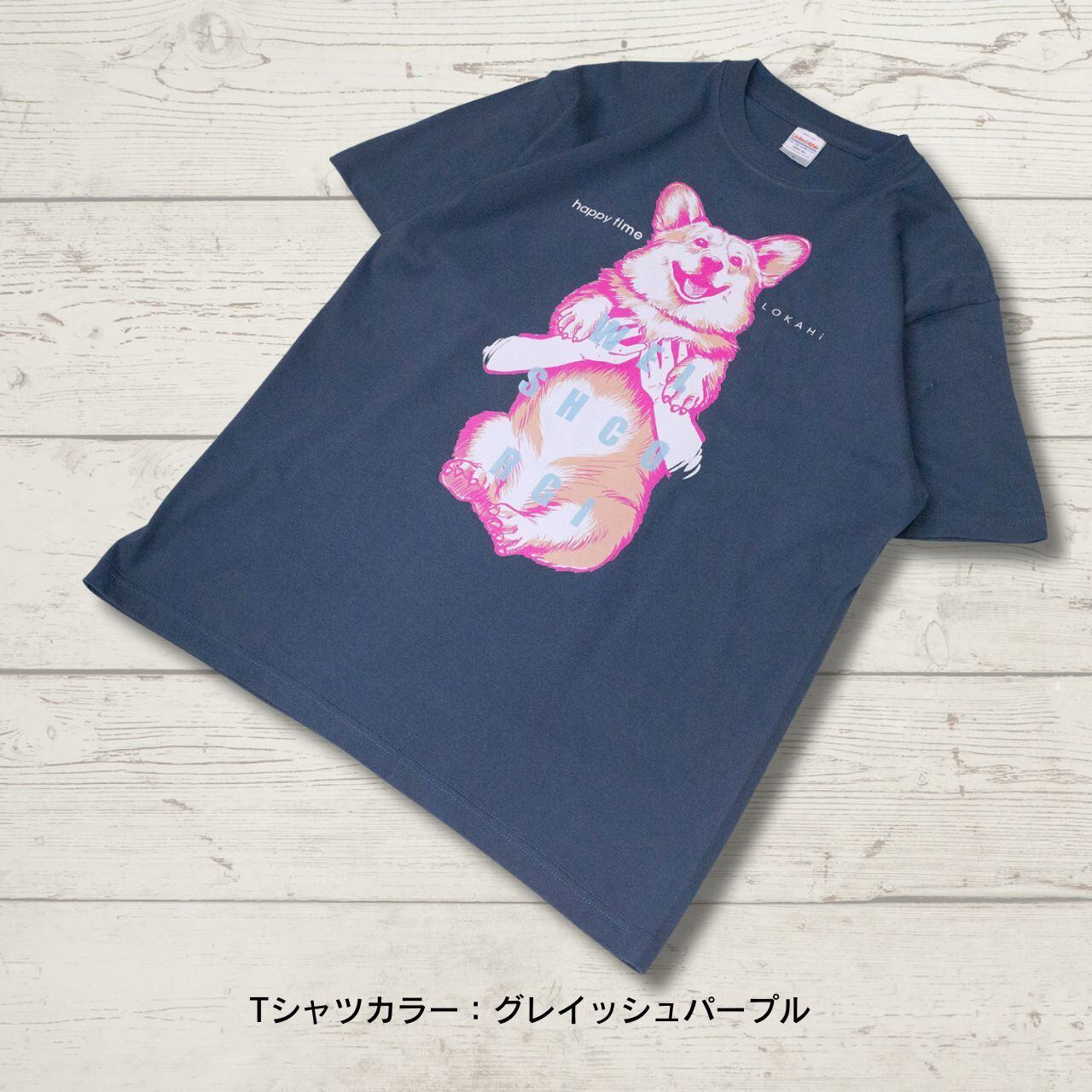 抱っこされたコーギーのイラストが、着る人も見る人もハッピーにしてくれるTシャツです。