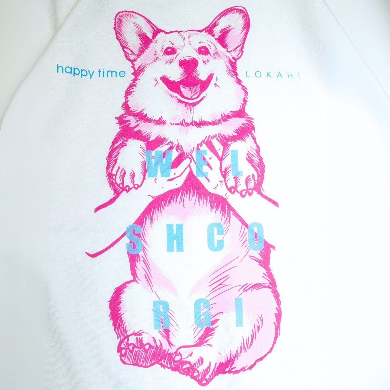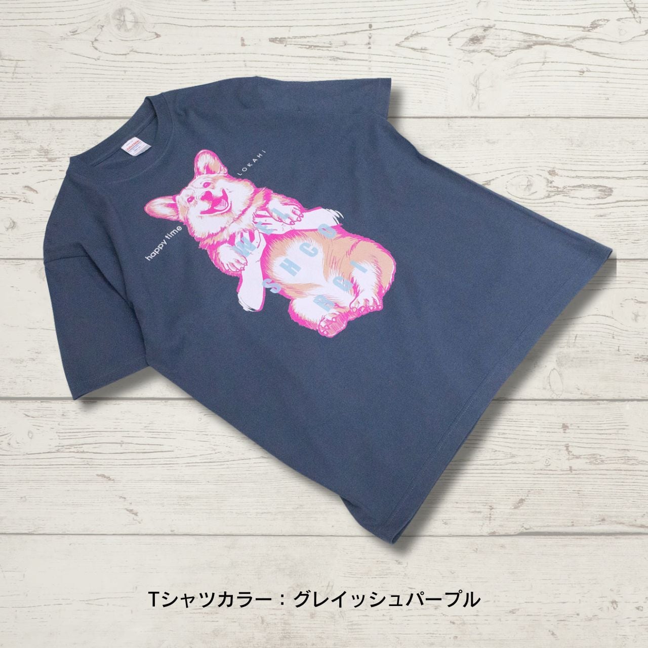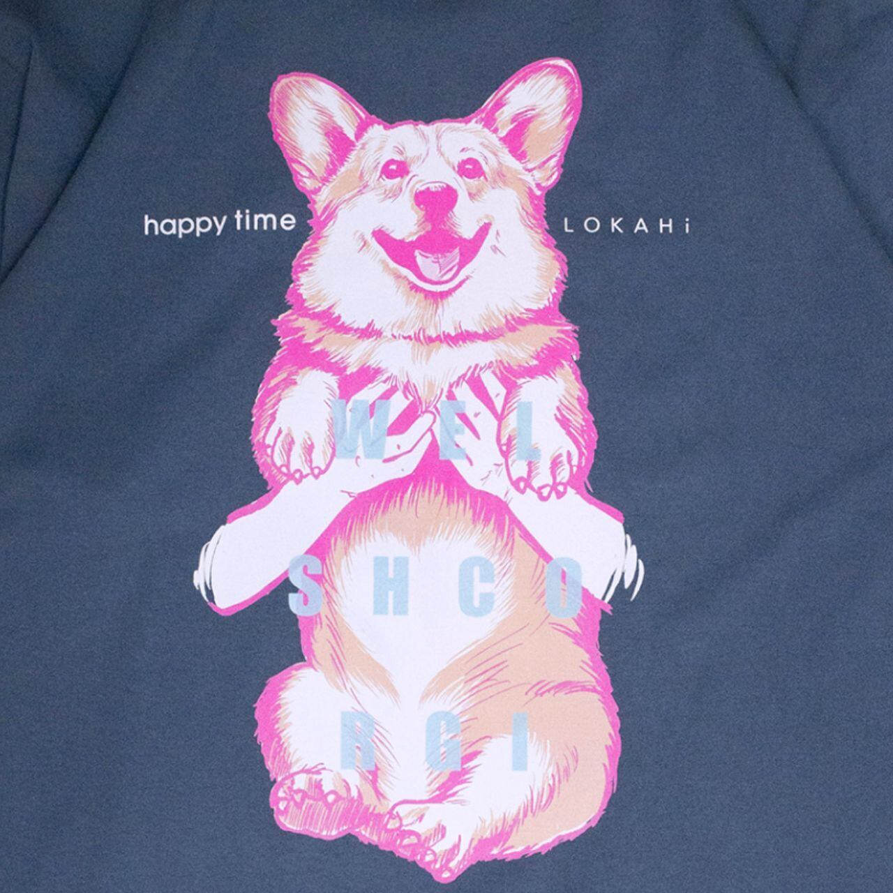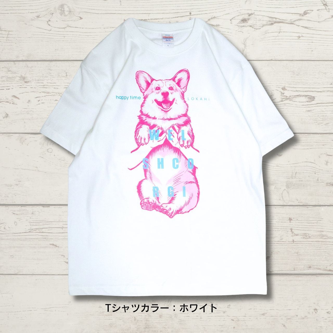 抱っこされたコーギーのイラストが、着る人も見る人もハッピーにしてくれるTシャツです。