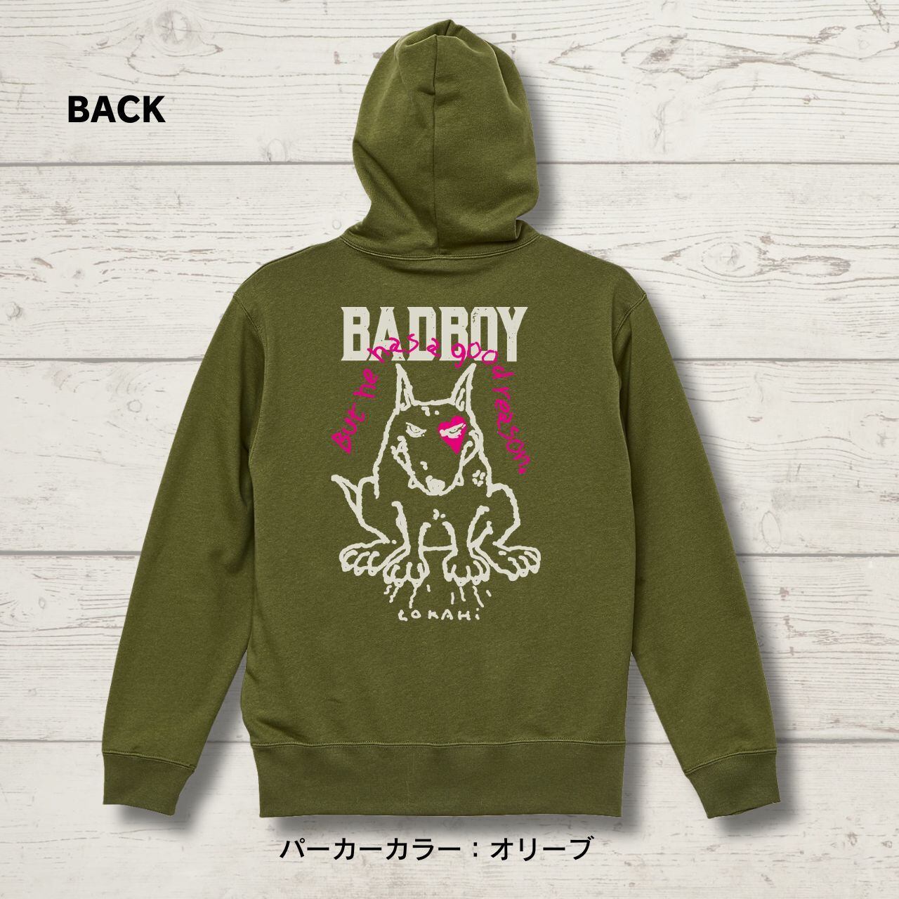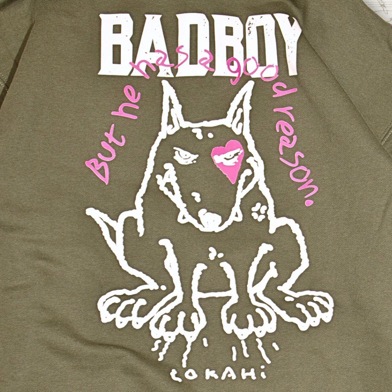 バックには存在感ある「BAD BOY」とワルな雰囲気のブルテリアのグラフィック。